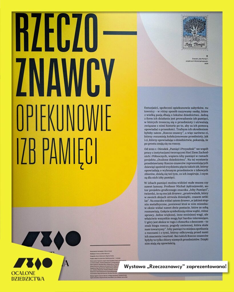 Wystawa mobilna pt. „Rzeczo-znawcy. Opiekunowie izb pamięci” – poświęcona jest opiekunom izb pamięci. Ekspozycja według koncepcji dr. Marcina Musiała powstała w ramach projektu „Ocalone Dziedzictwo”, realizowanego od 3 lat przez Ośrodek „Pamięć i Przyszłość” we współpracy z instytucjami tworzącymi Sieć Ziem Zachodnich i Północnych oraz dzięki środkom przyznanym przez Ministra Kultury i Dziedzictwa Narodowego.